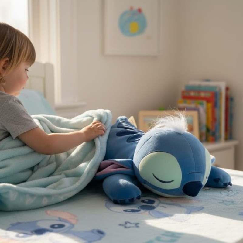 Incluye un almohadón con el personaje, diseñado como si estuviera acostado y durmiendo, que aporta una sensación de compañía y calma. Juntos forman un set funcional y adorable que combina abrigo, suavidad y diseño infantil, transformando cada pausa en un momento especial.