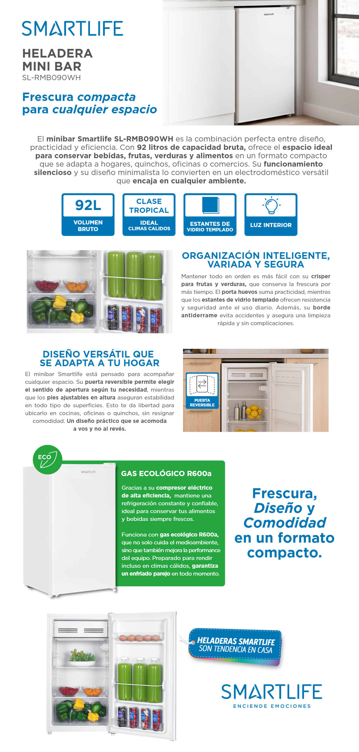 El Mini- Bar Smartlife de 89 litros es la solución práctica para quienes buscan comodidad en un formato compacto. Con un diseño elegante en blanco y estantes de vidrio templado con borde antiderrame, te permite organizar bebidas y alimentos sin complicaciones.