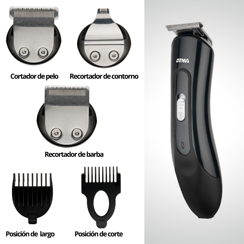 -Múltiples cabezales para diferentes usos: Corta pelo, recorta barba y recorta contornos.