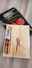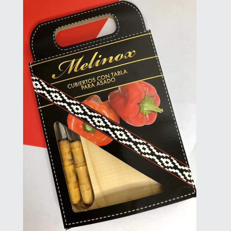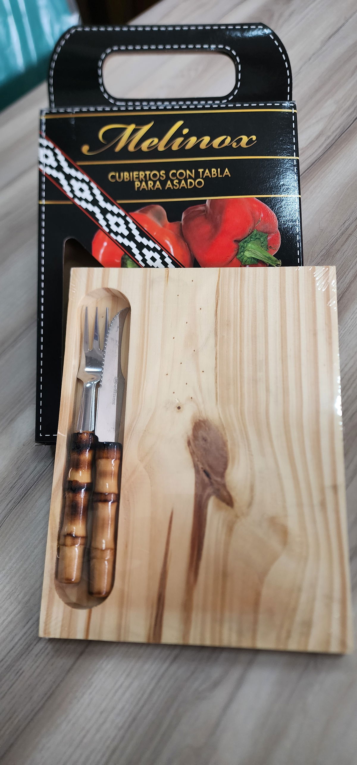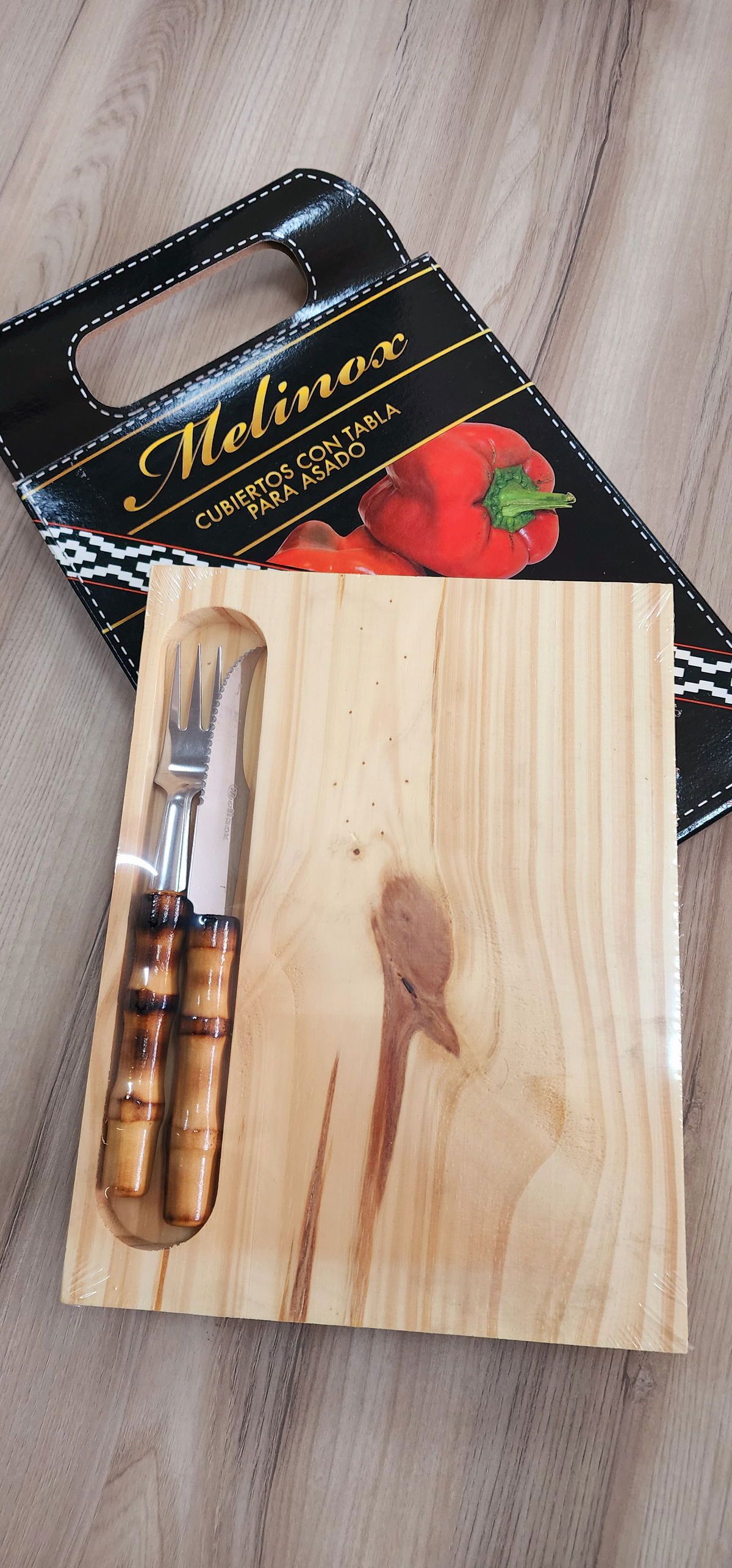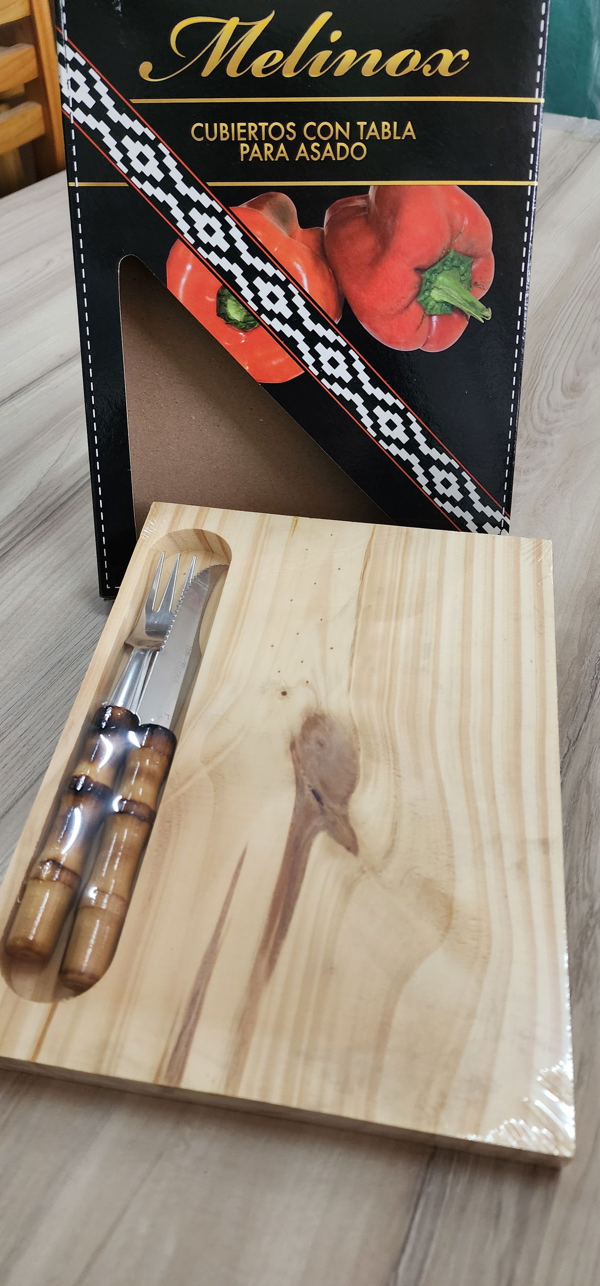Tabla de madera de 24x 18 cm + Juego de Cuchillo y Tenedor con mango de madera