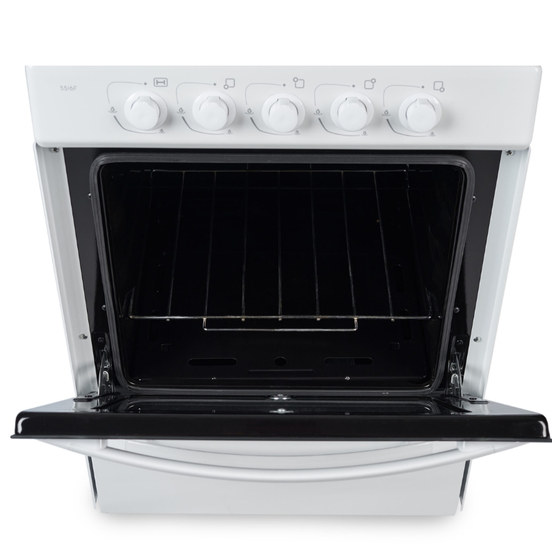 - El modelo 5516F dispone de una puerta con visor de doble vidrio templado con freno y desmontable; respaldo de vidrio y cajón parrilla rebatible. Por otro lado, el enlozado del horno y la parrilla son de fácil limpieza.