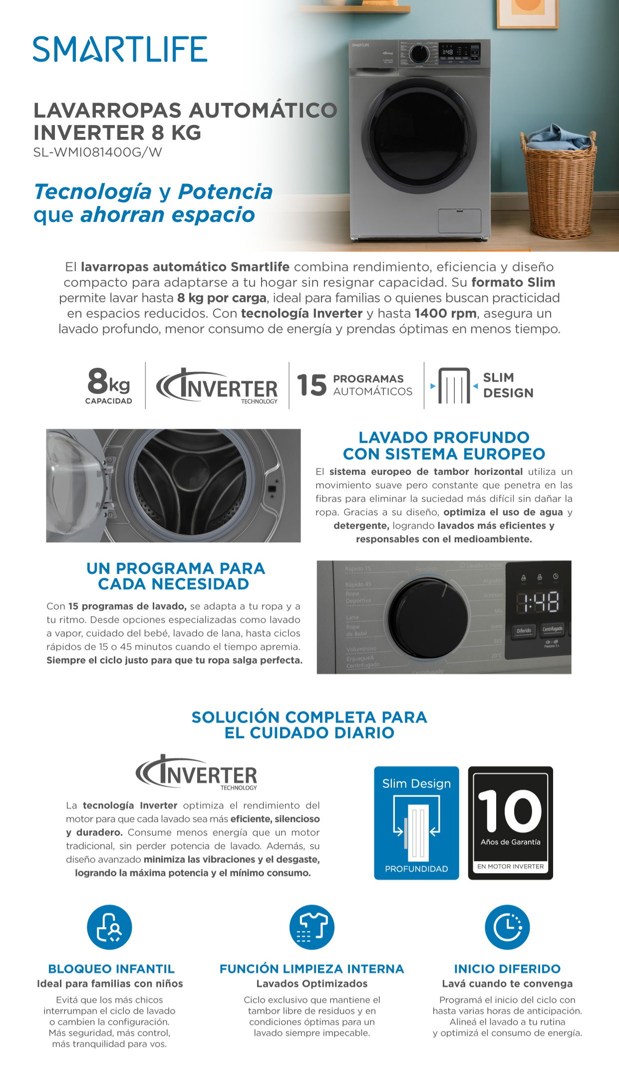 - Con 1400 RPM, ofrece lavados profundos y centrifugado rápido, reduciendo el tiempo de secado de la ropa. Smartlife te brinda un equipo compacto y de bajo consumo, pensado para simplificar tu vida.