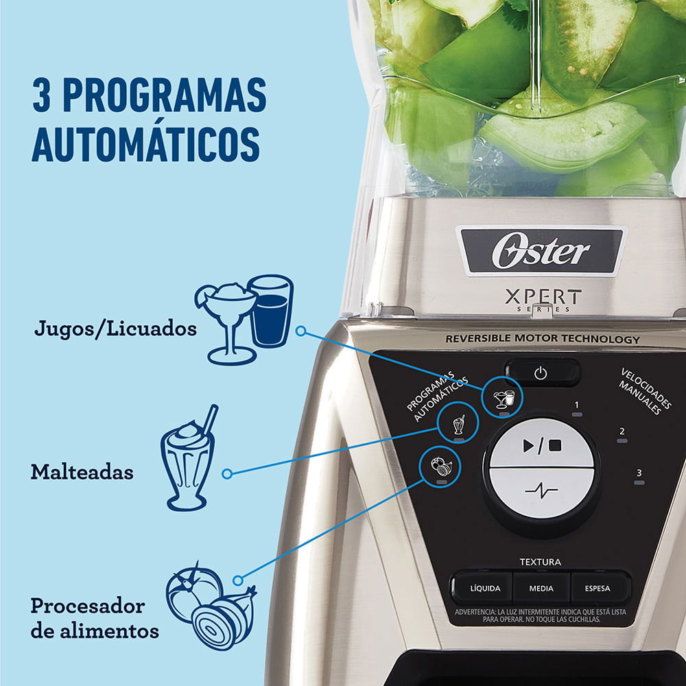 La licuadora Oster® Xpert Series™ con control de textura funciona de forma automática, gracias a sus 3 programas que garantizan una velocidad y un tiempo de operación preciso, para ofrecer resultados perfectos en mezclas densas con ingredientes duros. O también puedes seleccionar entre las tres velocidades manuales, para licuar mezclas más ligeras y sencillas.