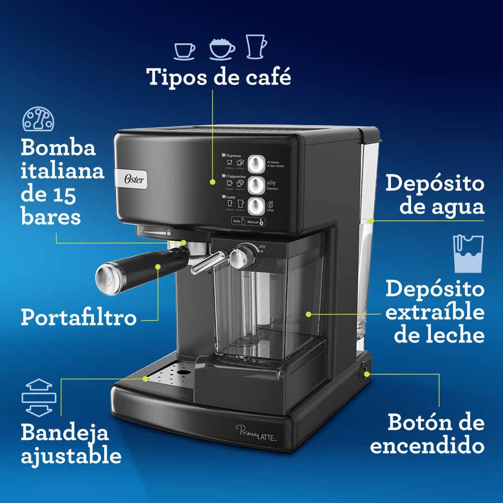 Vive la experiencia de un café auténtico y delicioso que ofrece la cafetera automática de espresso Oster® PrimaLatte™. Ahora con funciones que te permiten disfrutar variedades de bebidas, desde espresso, capuccinos y lattes, hasta el uso de cápsulas de Dolce Gusto*. Todo al toque de un botón.