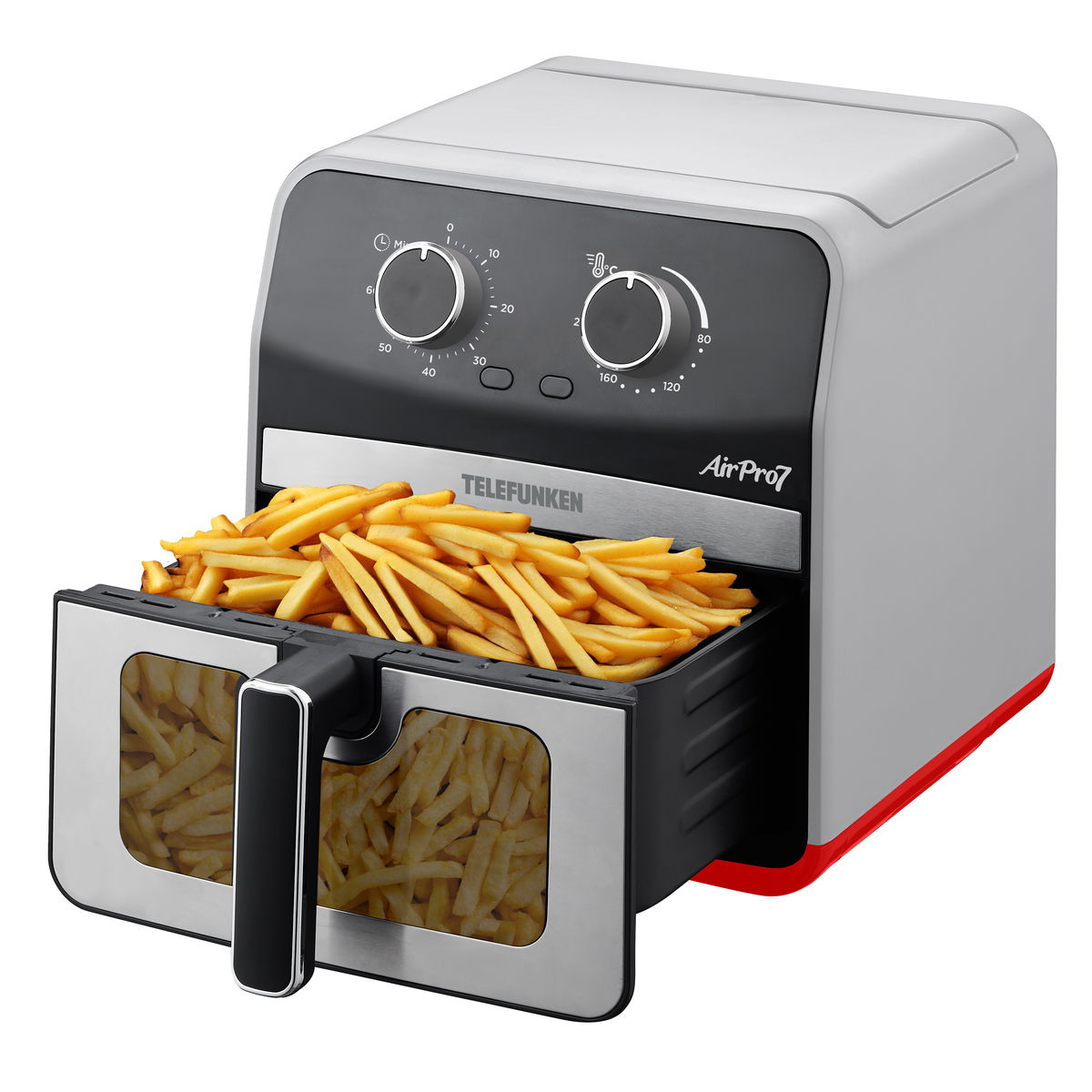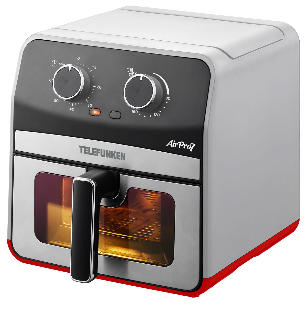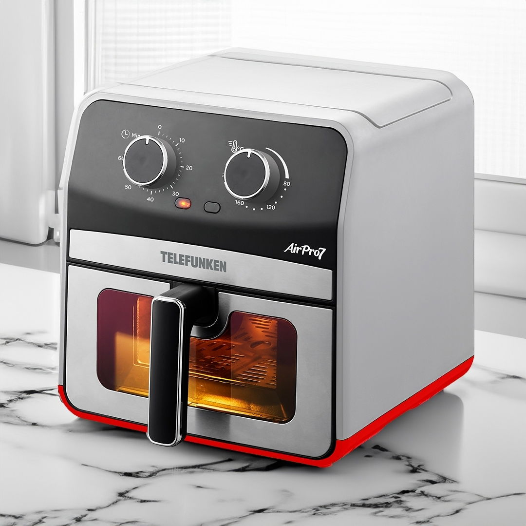Ideal para toda la familia , Descubre la freidora de aire de 7 litros Air Pro 7 de Telefunken, tu nuevo aliado en la cocina. Este versátil 3 en 1 te permite freír, tostar y asar de manera rápida y saludable. Con un asa fría al tacto y cocción por aire caliente con circulación de 360°, obtendrás resultados crujientes y uniformes.
