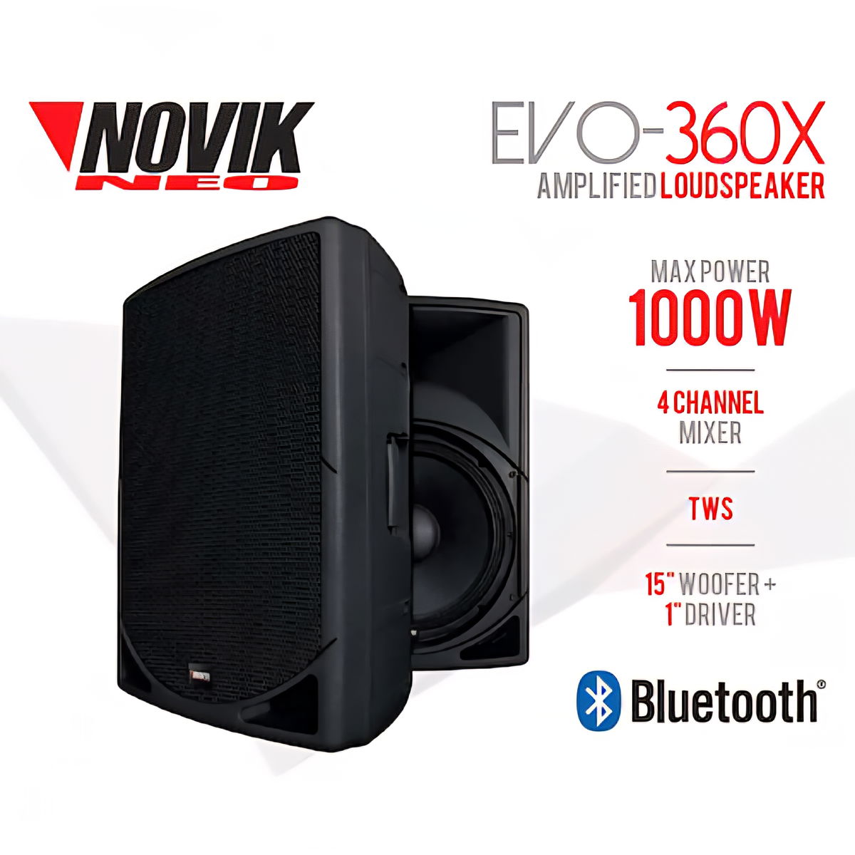 Bafle NOVIK EVO 360X Potenciado. Tecnología Bluetooth TWS . Combinan diseño con máxima potencia haciéndolos perfectos para adaptarse a cualquier situación de refuerzo de sonido en vivo, presentaciones musicales, DJs, entretenimiento y más. EVO series ofrece un completo sistema de 4 Canales de Mezcla, Entradas de Micrófono y de Línea para las situaciones más sofisticadas.