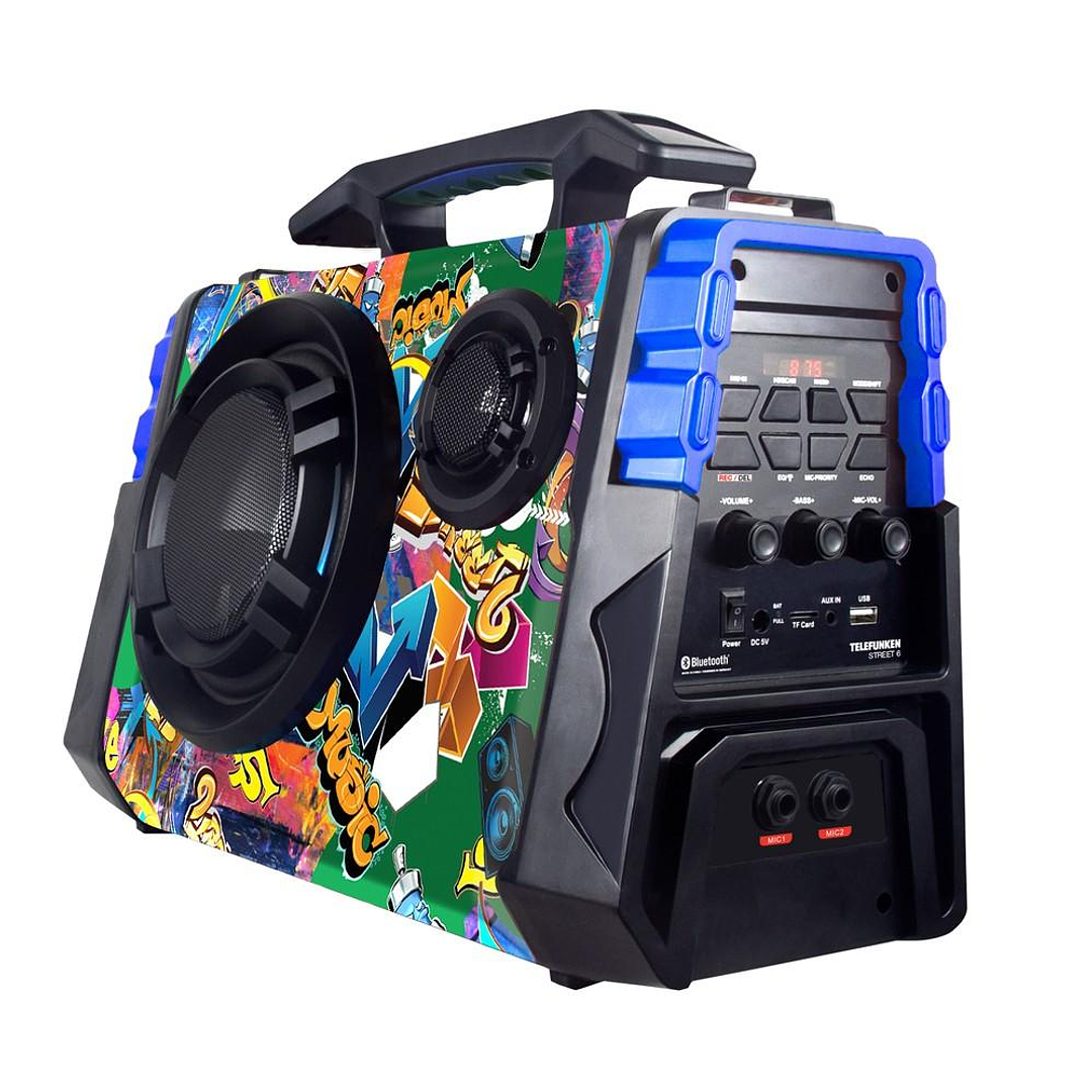 El Street 6 de TELEFUNKEN es un compacto sistema de sonido que posee batería interna, ideal para llevar a todas partes y a armar tu mini fiesta. Posee puerto USB, micro SB y conexión vía bluetooth para reproducir la música que más quieras desde un dispositivo móvil o Tablet. Además, posee puerto auxiliar e incluye un micrófono con cable y una correa para transportar el equipo de manera más fácil.