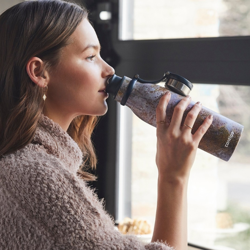 Con su elegante color metálico, podría pensar que la botella de agua de acero inoxidable con aislamiento al vacío THERMALOCK de Contigo Couture pertenece a una galería de arte. Pero espera, esta botella térmica también mantiene las bebidas frías hasta 24 horas o calientes hasta 10 horas.