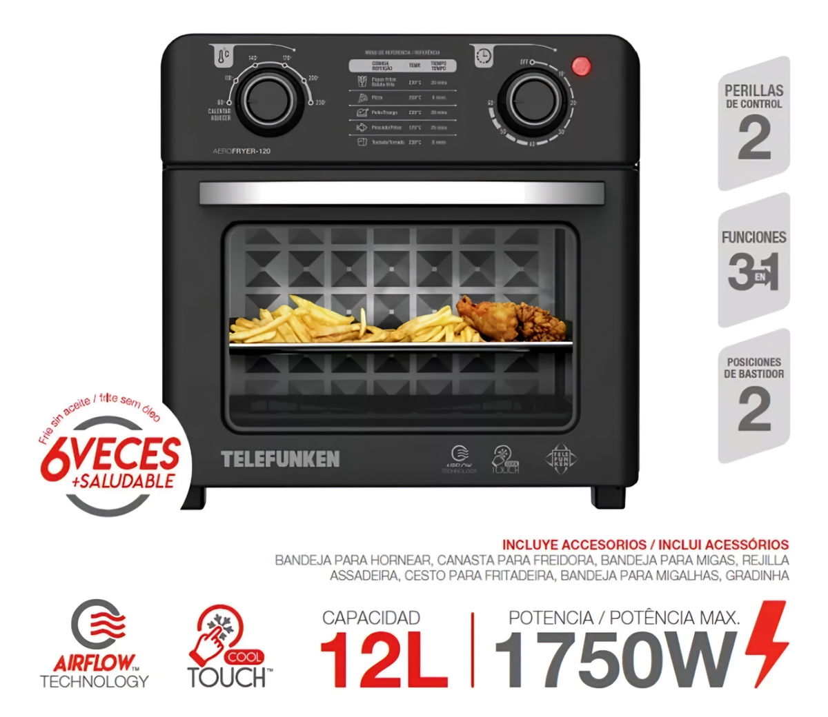 - 3 funciones: Freír, tostar, calentar