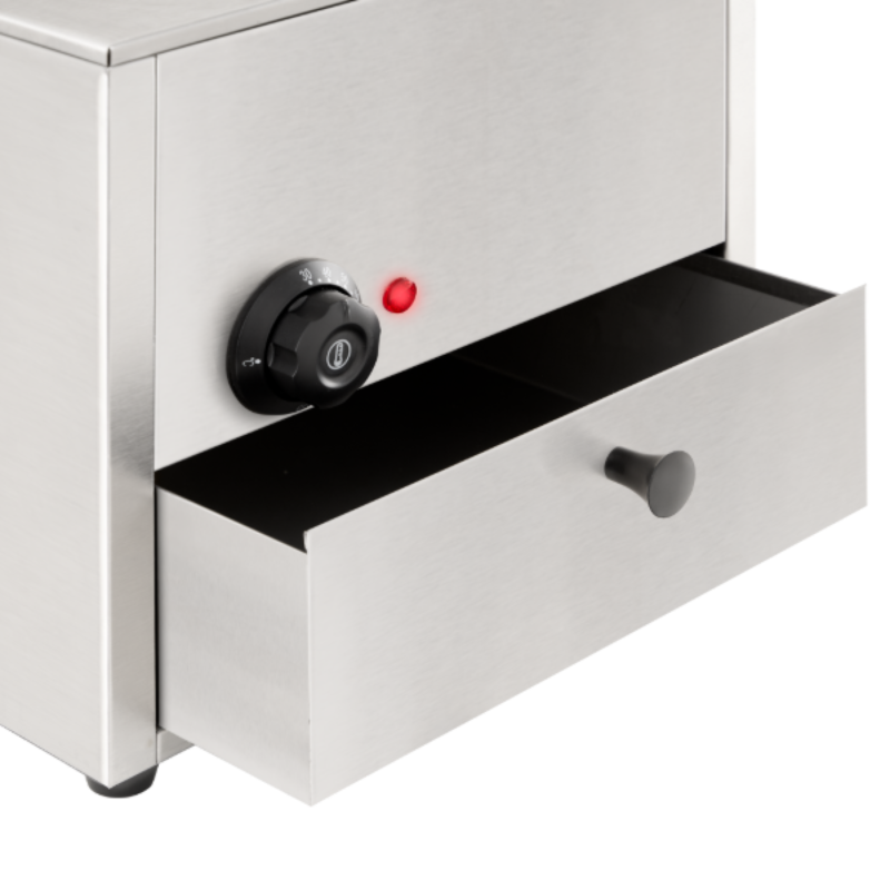 Con un elegante diseño en acero inoxidable, este equipo no solo cocina tus salchichas de forma eficiente, sino que también cuenta con un compartimento para que los panes mantengan esa temperatura y esponjosidad perfectas.